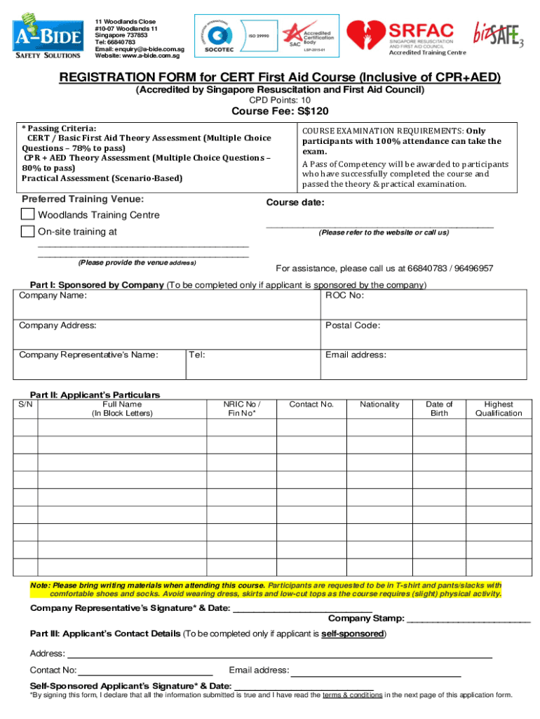 11 Woodlands Close #1007 Woodlands 11 Singapore 737853 Tel: 66840783 Email: enquiry@abide.com.sg Website: www.abide.com.sgREGISTRATION FORM for CERT First Aid Course (Inclusive of CPR+AED) (Accredited