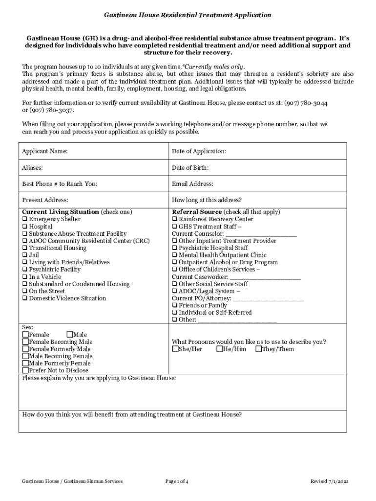 Gastineau House Residential Treatment ApplicationGastineau House (GH) is a drug and alcoholfree residential substance abuse treatment program. Its designed for individuals who have completed residential