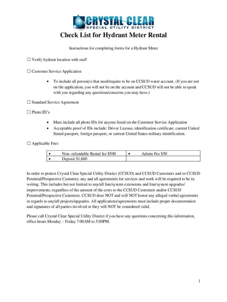 Check List for Hydrant Meter Rental Instructions for completing forms for a Hydrant Meter Verify hydrant location with staff Customer Service Application To include all person(s) that need/require
