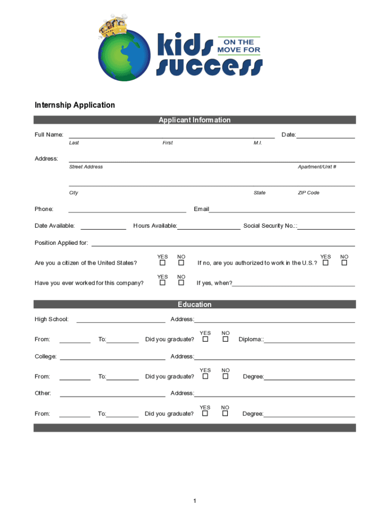 Internship Application Applicant Information Full Name:Date: LastFirstM.I.Address: Street AddressApartment/Unit #CityStatePhone:ZIP CodeEmailDate Available:Hours Available:Social Security No.::Position