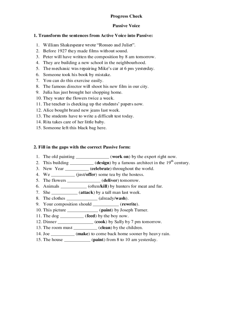Progress Check Passive Voice 1. Transform the sentences from Active Voice into Passive: 1. William Shakespeare wrote Romeo and Juliet. 2. Before 1927 they made films without sound. 3. Peter will have