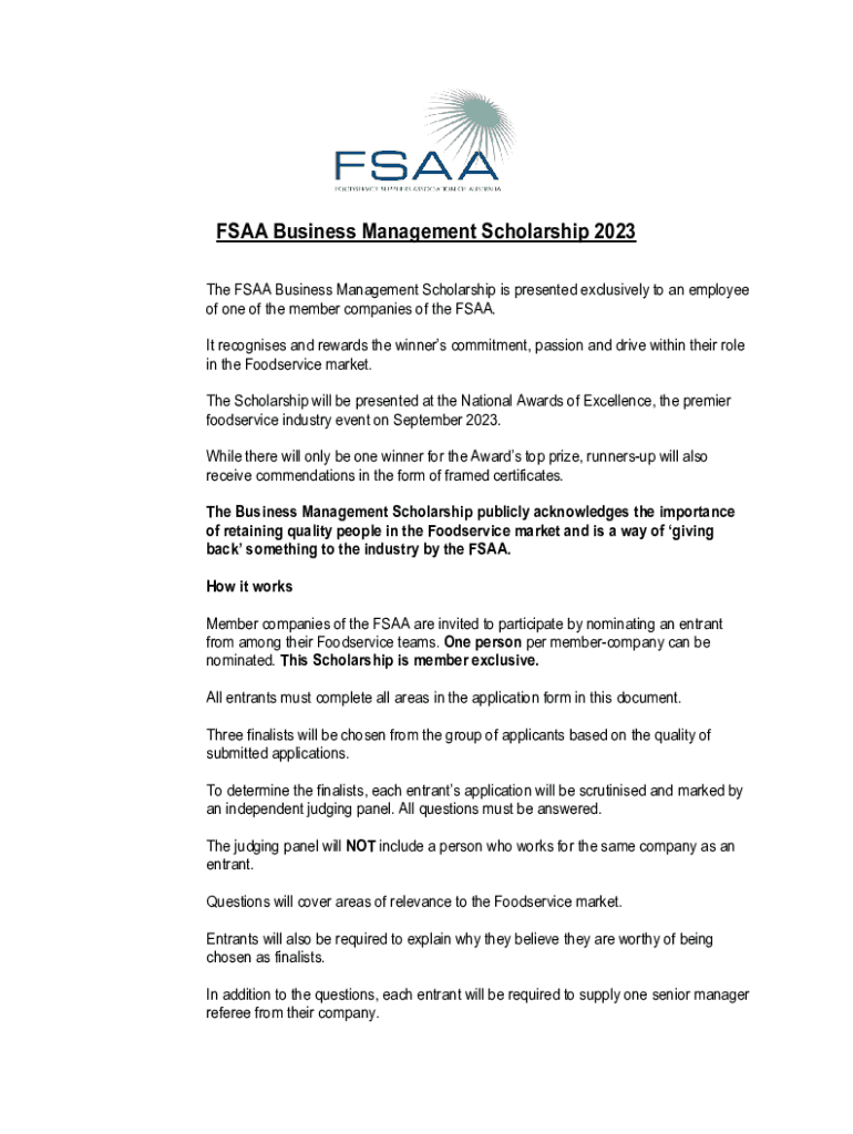 FSAA Business Management Scholarship 2023 The FSAA Business Management Scholarship is presented exclusively to an employee of one of the member companies of the FSAA. It recognises and rewards the