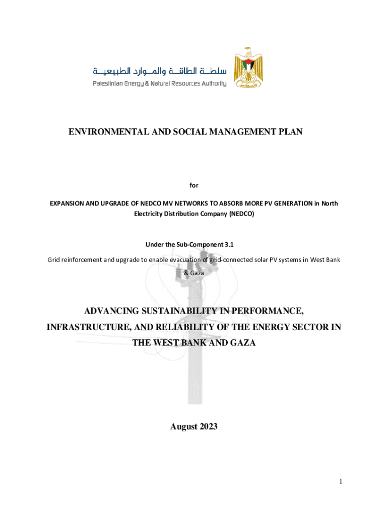 ENVIRONMENTAL AND SOCIAL MANAGEMENT PLANfor EXPANSION AND UPGRADE OF NEDCO MV NETWORKS TO ABSORB MORE PV GENERATION in North Electricity Distribution Company (NEDCO)Under the SubComponent 3.1 Grid