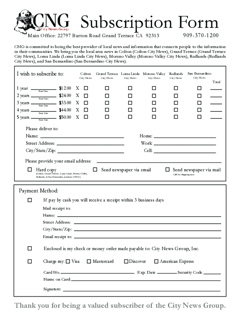 Subscription Form 90937 01200Main Office: 22797 Barton Road Grand Terrace CA 92313CNG is committed to being the best provider of local news and information that connects people to the information