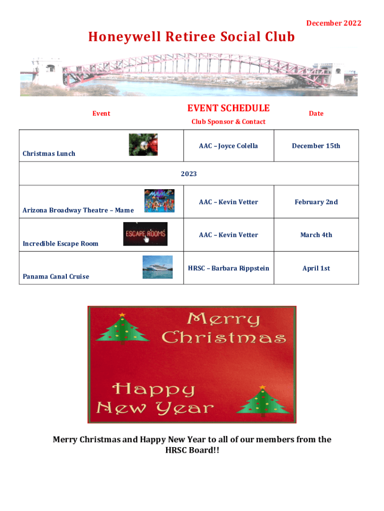 December 2022Honeywell Retiree Social ClubEVENT SCHEDULEEventChristmas LunchDateClub Sponsor & ContactAAC Joyce ColellaDecember 15thAAC Kevin VetterFebruary 2ndAAC Kevin VetterMarch 4thHRSC Barbara
