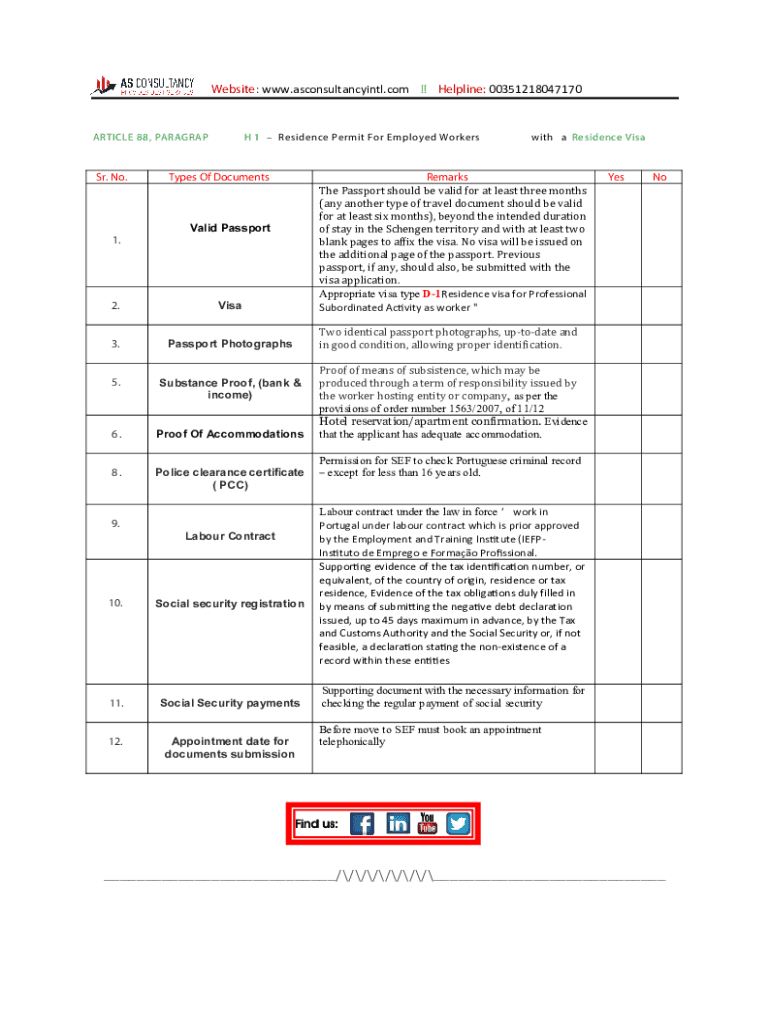 Website: www.asconsultancyintl.com !! Helpline: 00351218047170ARTICLE 88, PARAGRAPSr. No.1.H 1 Residence Permit For Employed WorkersTypes Of DocumentsValid Passport2.Visa3.Passport Photographs5.Substance