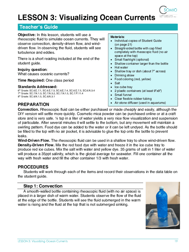 LESSON 3: Visualizing Ocean Currents Teachers Guide Objective: In this lesson, students will use a rheoscopic fluid to simulate ocean currents. They will observe convection, densitydriven flow, and