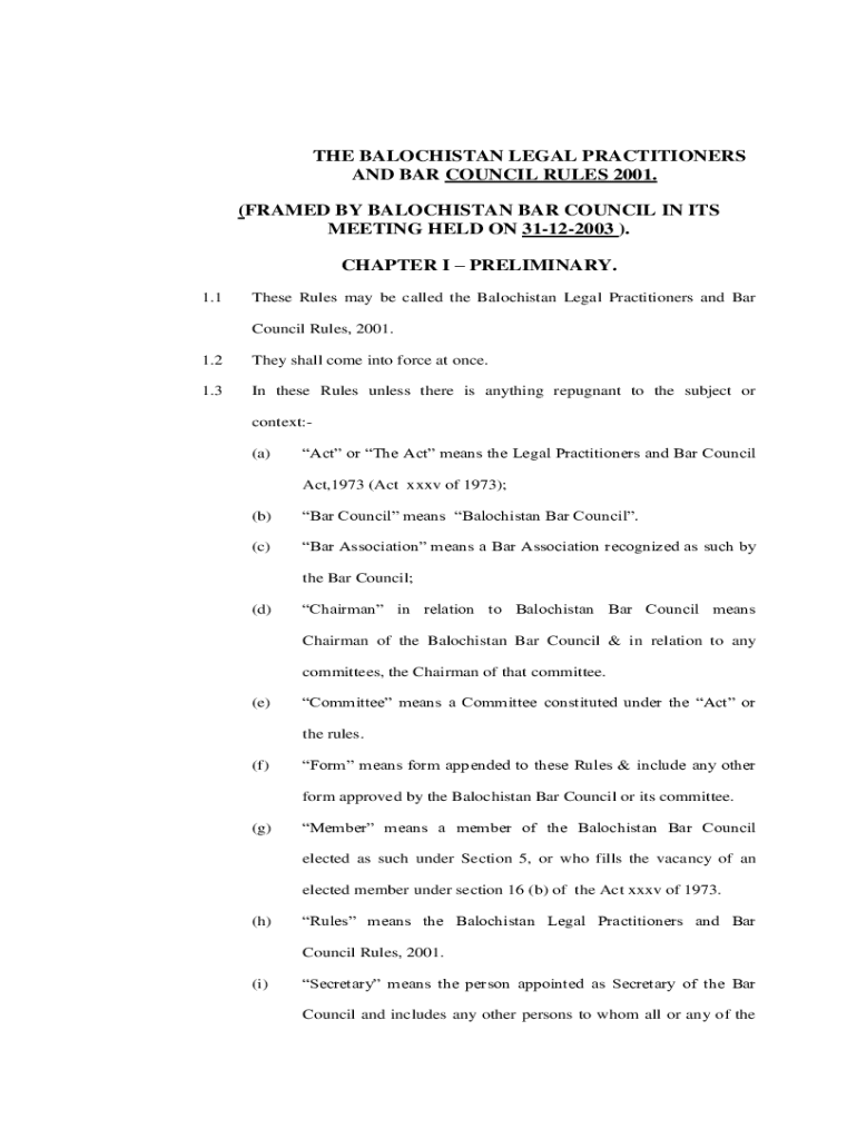 THE BALOCHISTAN LEGAL PRACTITIONERS AND BAR COUNCIL RULES 2001. (FRAMED BY BALOCHISTAN BAR COUNCIL IN ITS MEETING HELD ON 31122003 ). CHAPTER I PRELIMINARY. 1.1These Rules may be called the Balochistan