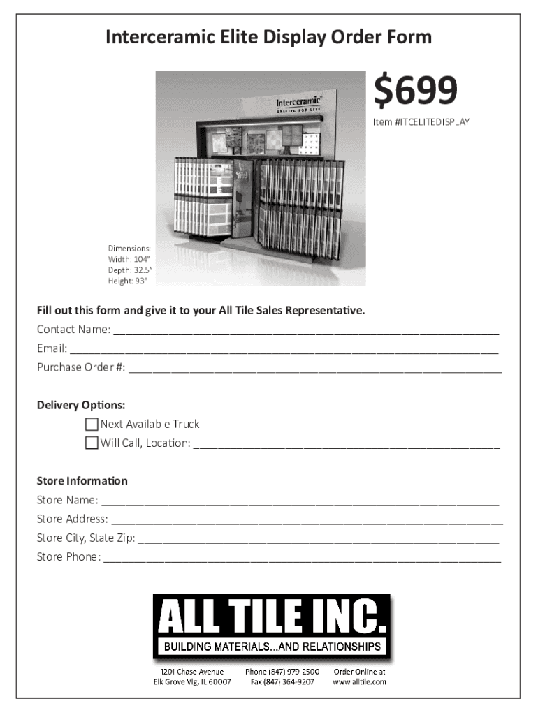 Interceramic Elite Display Order Form$699Item #ITCELITEDISPLAYDimensions: Width: 104 Depth: 32.5 Height: 93Fill out this form and give it to your All Tile Sales Representative. Contact Name: ___ Email: