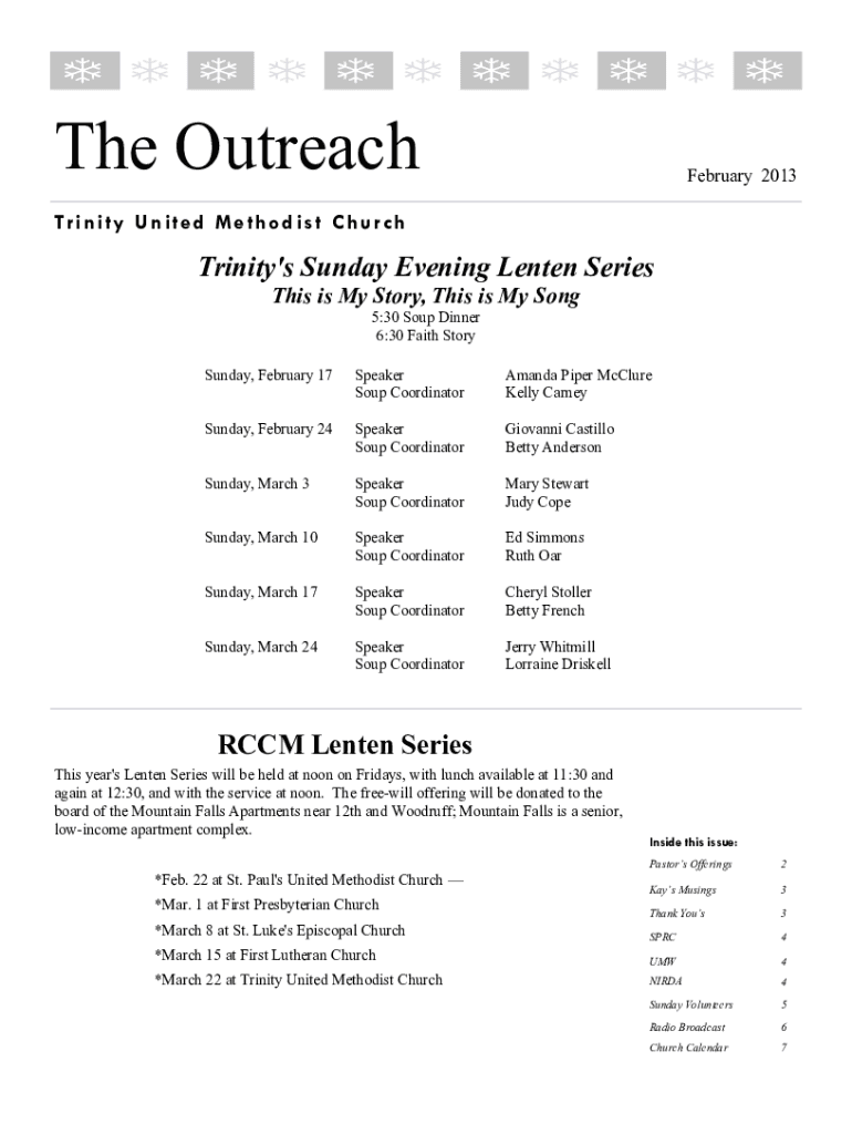 The OutreachFebruary 2013Trinity United Methodist ChurchTrinity\'s Sunday Evening Lenten Series This is My Story, This is My Song 5:30 Soup Dinner 6:30 Faith Story Sunday, February 17Speaker Soup