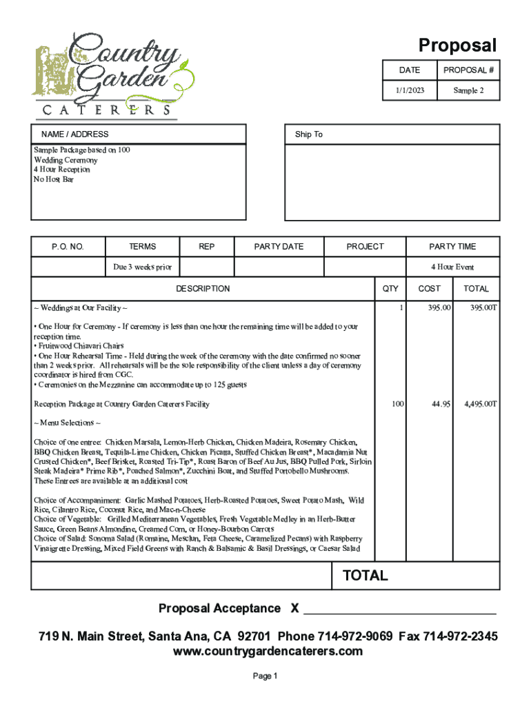 ProposalNAME / ADDRESSDATEPROPOSAL #1/1/2023Sample 2Ship ToSample Package based on 100 Wedding Ceremony 4 Hour Reception No Host BarP.O. NO.TERMSREPPARTY DATEPROJECTPARTY TIMEDue 3 weeks prior4 Hour