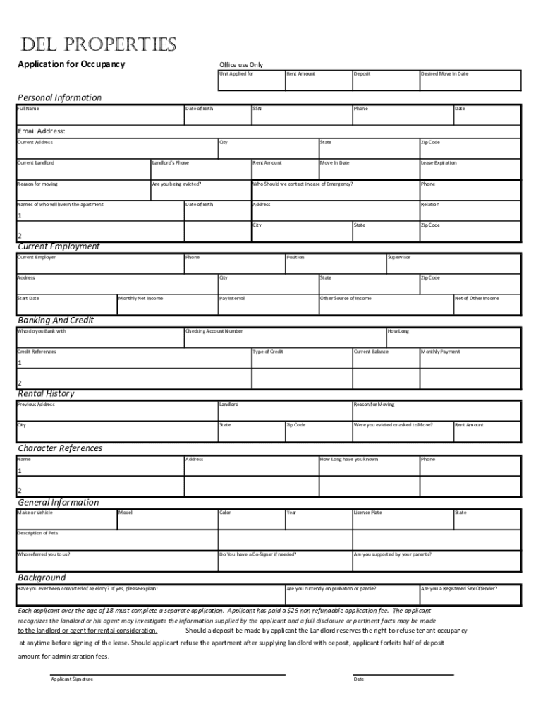 Del Properties Application for OccupancyOffice use Only Unit Applied forRent AmountDepositDesired Move In DatePersonal Information Full NameDate of BirthSSNPhoneDateEmail Address: Current AddressCityStateZip