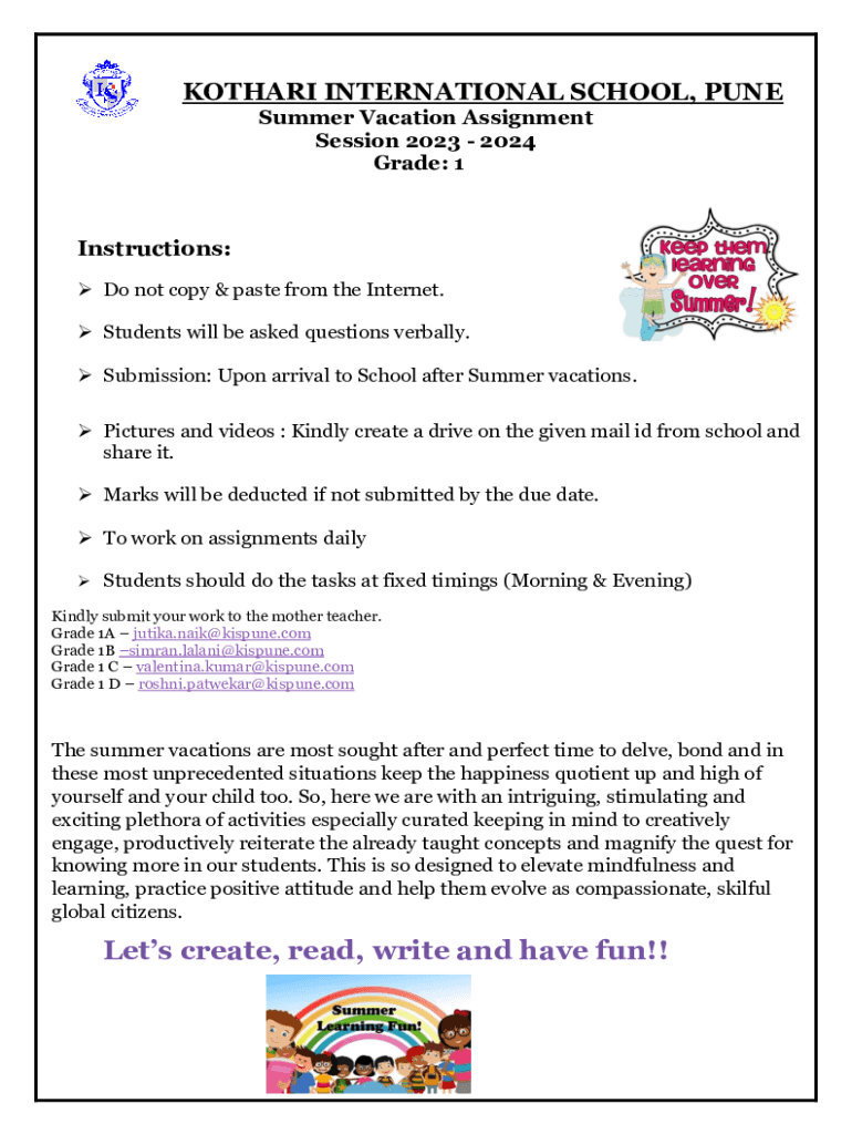 KOTHARI INTERNATIONAL SCHOOL, PUNE Summer Vacation Assignment Session 2023 2024 Grade: 1Instructions: Do not copy & paste from the Internet. Students will be asked questions verbally. Submission: