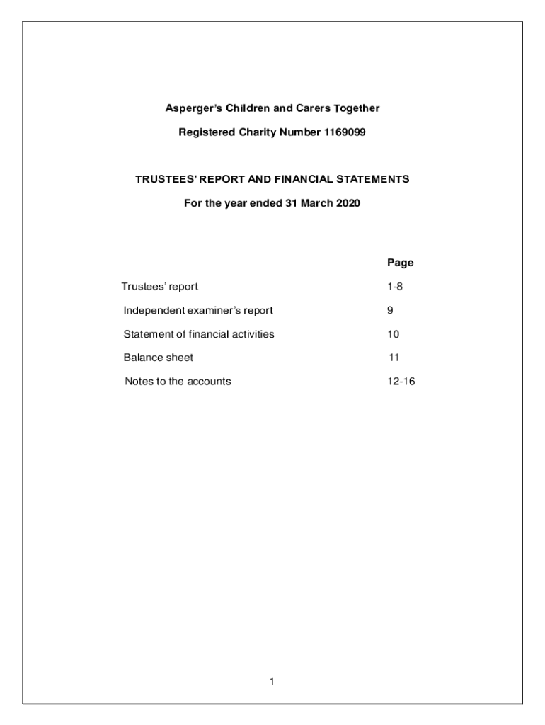 Aspergers Children and Carers Together Registered Charity Number 1169099TRUSTEES REPORT AND FINANCIAL STATEMENTS For the year ended 31 March 2020Page Trustees report18Independent examiners report9Statement
