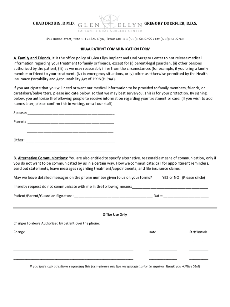 CHAD DROUIN, D.M.D.GREGORY DOERFLER, D.D.S.493 Duane Street, Suite 301 Glen Ellyn, Illinois 60137 (630) 8585755 Fax (630) 8585760HIPAA PATIENT COMMUNICATION FORM A. Family and Friends. It is the office