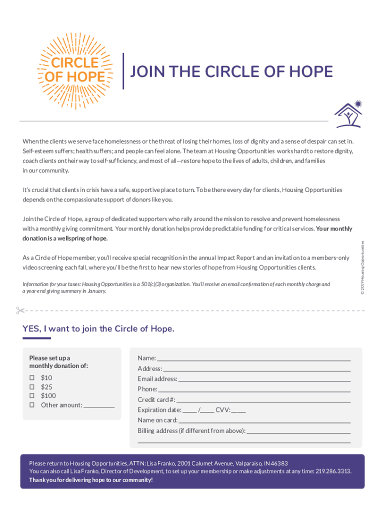 JOIN THE CIRCLE OF HOPEWhen the clients we serve face homelessness or the threat of losing their homes, loss of dignity and a sense of despair can set in. Selfesteem suffers; health suffers; and people
