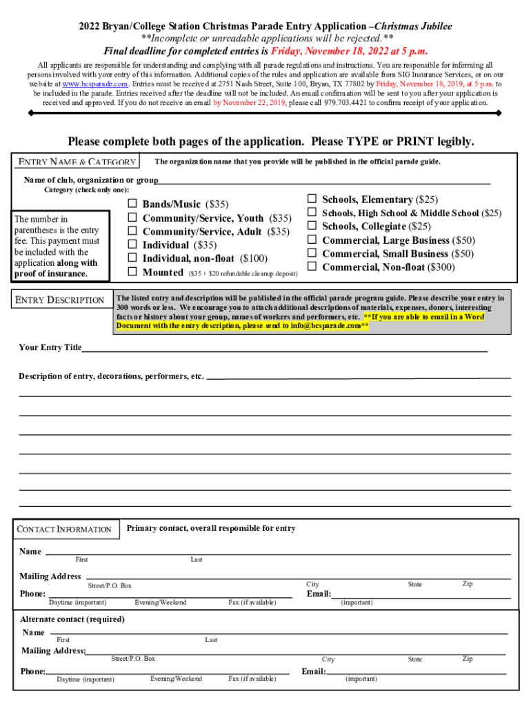 2022 Bryan/College Station Christmas Parade Entry Application Christmas Jubilee **Incomplete or unreadable applications will be rejected.** Final deadline for completed entries is Friday, November
