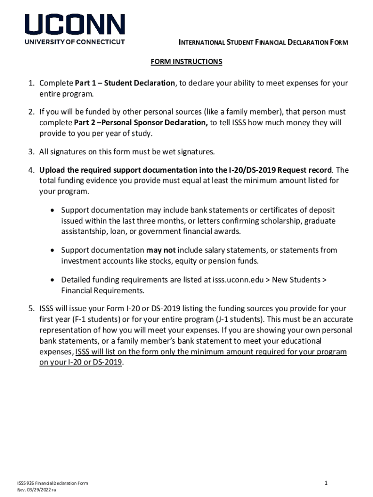 INTERNATIONAL STUDENT FINANCIAL DECLARATION FORM FORM INSTRUCTIONS1. Complete Part 1 Student Declaration, to declare your ability to meet expenses for your entire program. 2. If you will be funded