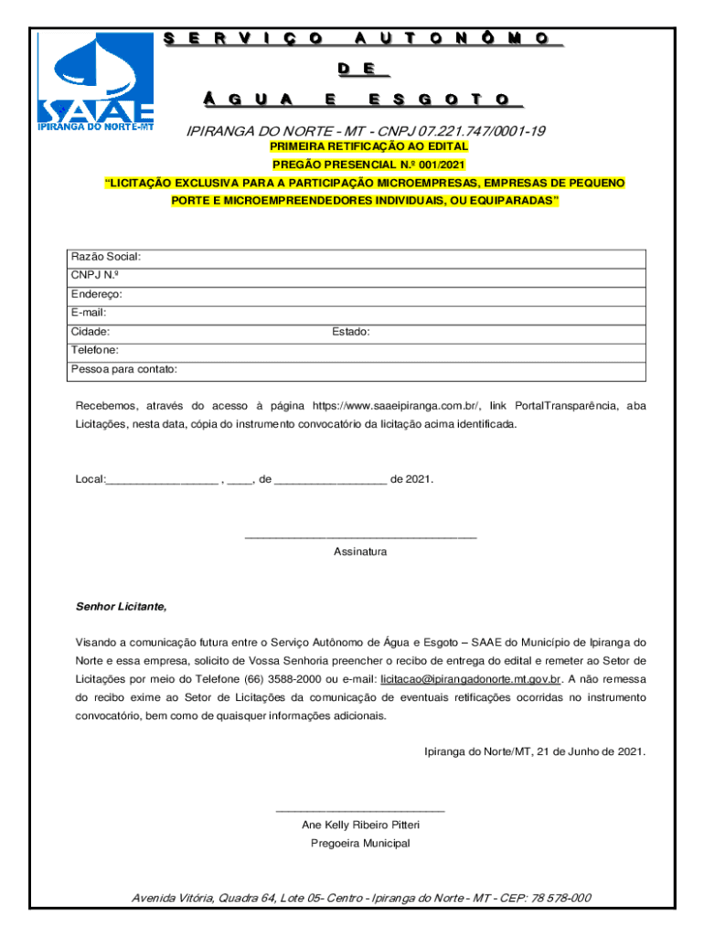 S S E E R R V V II O OA A U U T T O O N N M M O O D D E E G G U U A AE EE E S S G G O O T T O OIPIRANGA DO NORTE MT CNPJ 07.221.747/000119 PRIMEIRA RETIFICAO AO EDITAL PREGO PRESENCIAL N. 001/2021