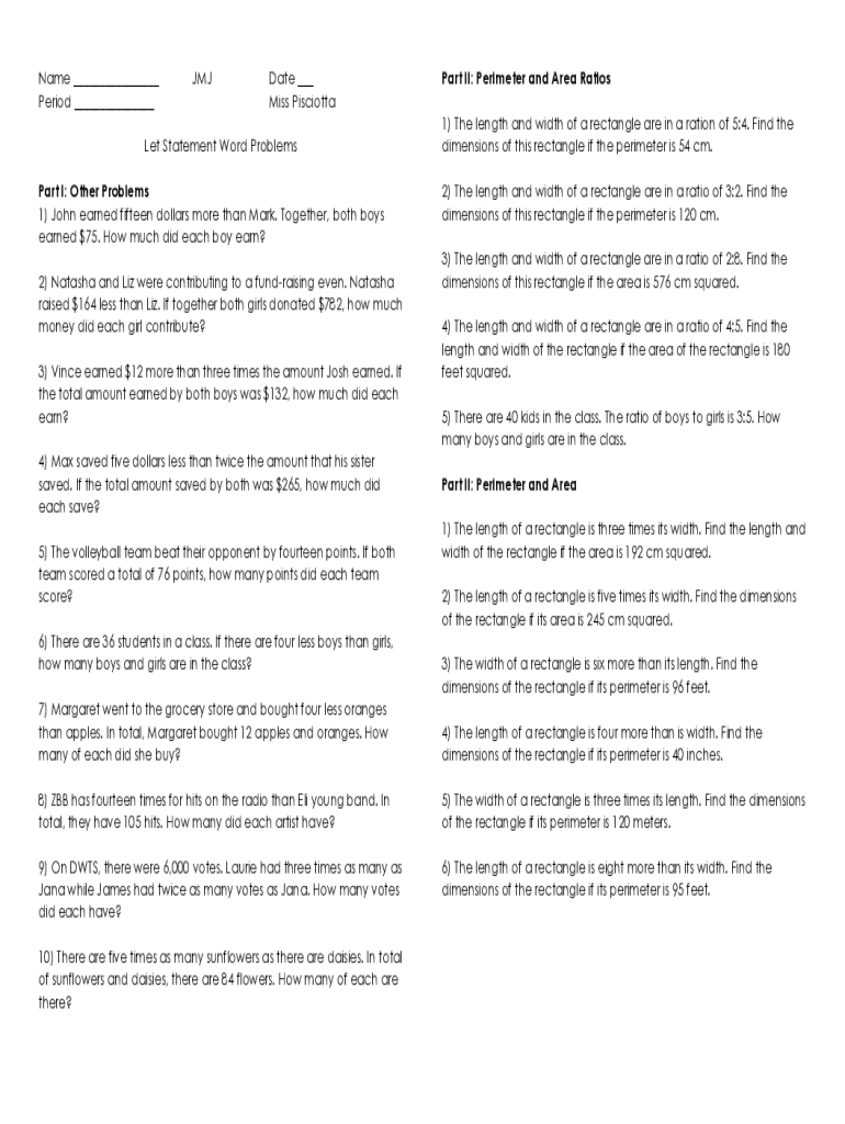 Name ___ Period ___JMJDate ___ Miss PisciottaLet Statement Word Problems Part I: Other Problems 1) John earned fifteen dollars more than Mark. Together, both boys earned $75. How much did each boy