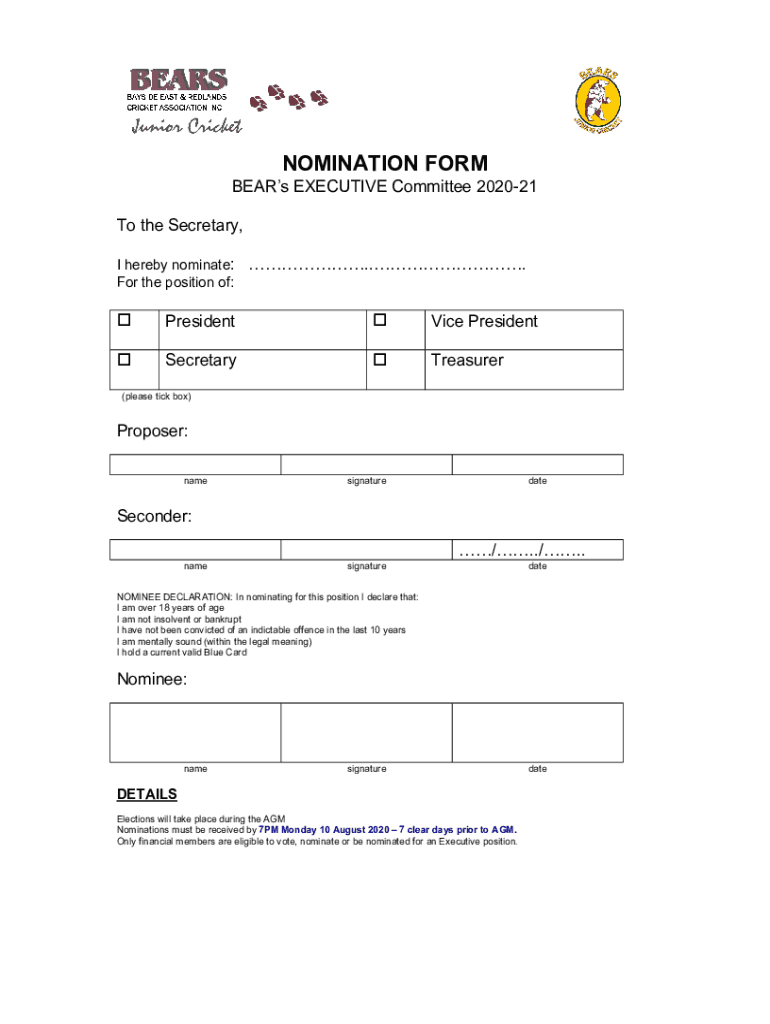NOMINATION FORM BEARs EXECUTIVE Committee 202021 To the Secretary, I hereby nominate: ... For the position of:PresidentVice PresidentSecretaryTreasurer(please tick box)Proposer: namesignaturedateSeconder: