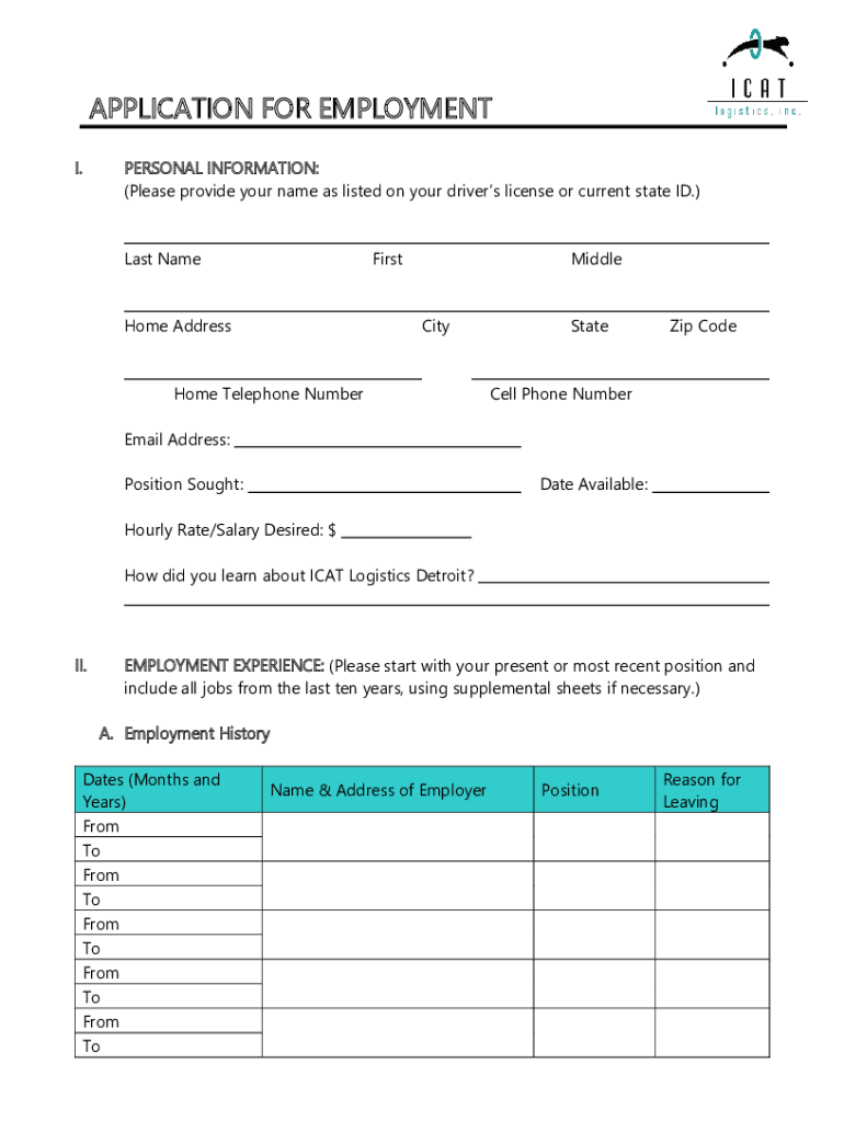 APPLICATION FOR EMPLOYMENT I.PERSONAL INFORMATION: (Please provide your name as listed on your drivers license or current state ID.) Last NameFirstHome AddressMiddle CityHome Telephone NumberStateZip