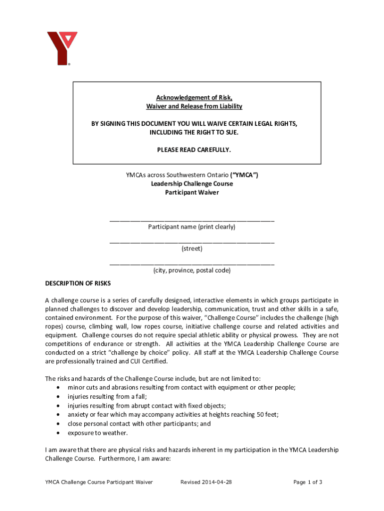 Acknowledgement of Risk, Waiver and Release from Liability BY SIGNING THIS DOCUMENT YOU WILL WAIVE CERTAIN LEGAL RIGHTS, INCLUDING THE RIGHT TO SUE. PLEASE READ CAREFULLY.YMCAs across Southwestern