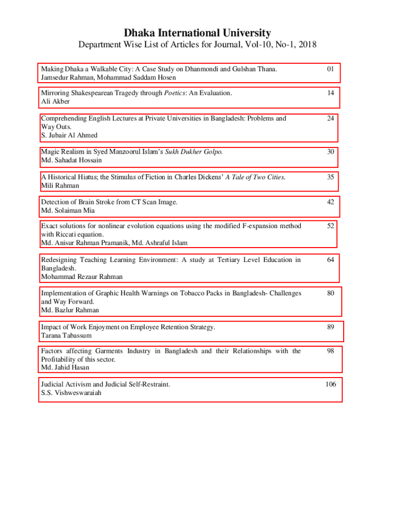 Dhaka International University Department Wise List of Articles for Journal, Vol10, No1, 2018 Making Dhaka a Walkable City: A Case Study on Dhanmondi and Gulshan Thana. Jamsedur Rahman, Mohammad Saddam