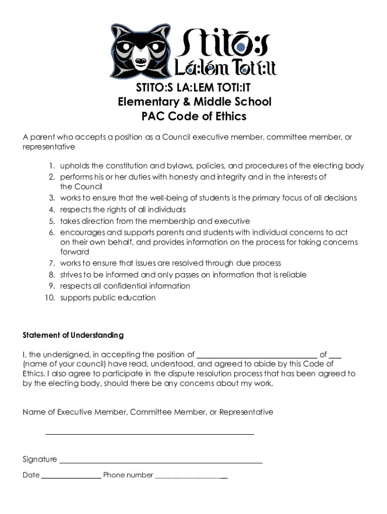 STITO:S LA:LEM TOTI:IT Elementary & Middle School PAC Code of Ethics A parent who accepts a position as a Council executive member, committee member, or representative 1. upholds the constitution