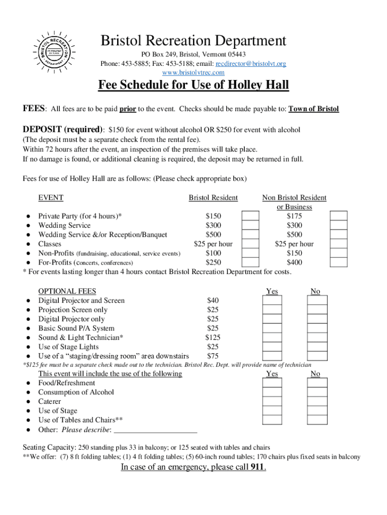Bristol Recreation Department PO Box 249, Bristol, Vermont 05443 Phone: 4535885; Fax: 4535188; email: recdirector@bristolvt.org www.bristolvtrec.comFee Schedule for Use of Holley Hall FEES: All fees