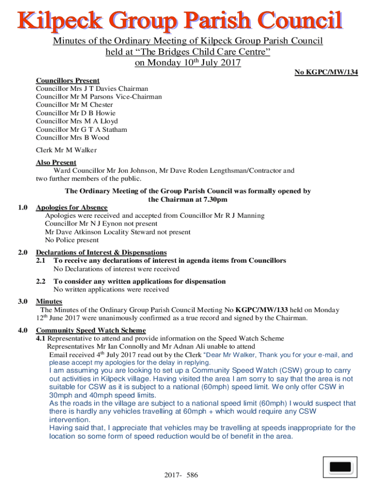 Minutes of the Ordinary Meeting of Kilpeck Group Parish Council held at The Bridges Child Care Centre on Monday 10th July 2017 No KGPC/MW/134 Councillors Present Councillor Mrs J T Davies Chairman
