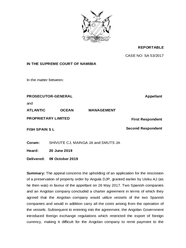 The Namibia's Fishrot scandal: fishing crew sue over non- ... is a fillable form in MS Word extension that has to be completed and signed for certain reasons. Then, it is furnished to the relevant addressee in order to provide some info of certain kinds. The completion and signing can be done in hard copy by hand or with a suitable solution e. g. PDFfiller. Such applications help to fill out any PDF or Word file without printing out. It also allows you to customize it depending on your requirements and put a legal electronic signature. Once finished, the user sends the Namibia's Fishrot scandal: fishing crew sue over non- ... to the respective recipient or several of them by mail or fax. PDFfiller is known for a feature and options that make your template printable. It provides a number of options for printing out. It does no matter how you will send a form after filling it out - in hard copy or by email - it will always look well-designed and firm. In order not to create a new file from scratch every time, make the original file as a template. After that, you will have a customizable sample.