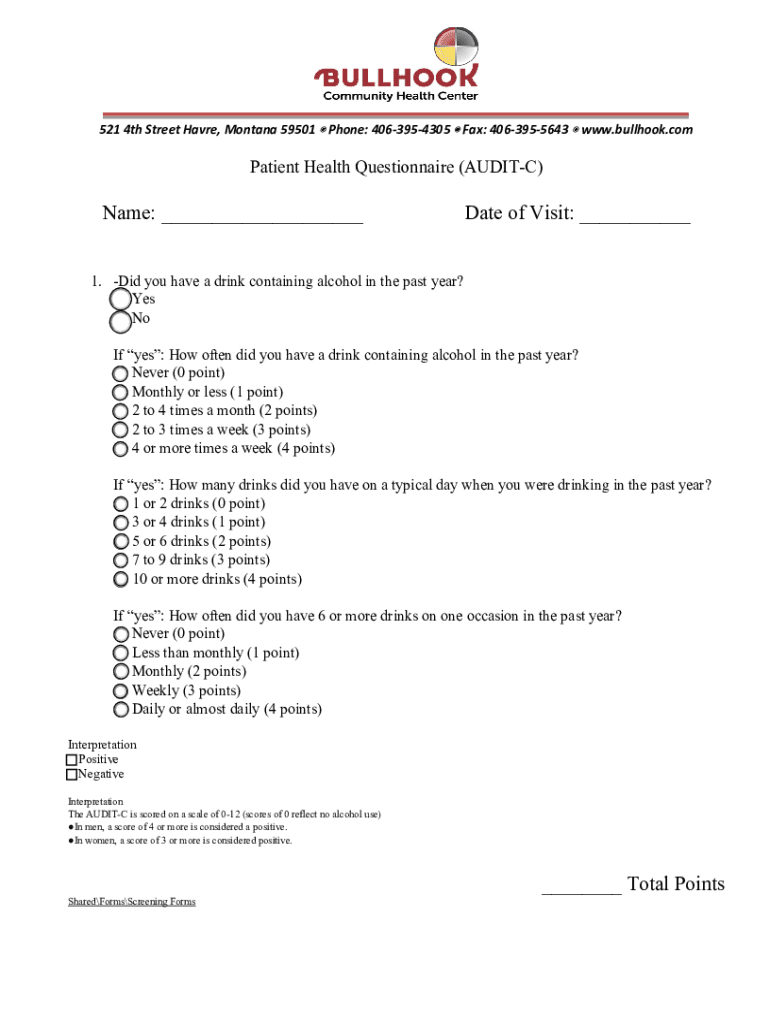 521 4th Street Havre, Montana 59501 Phone: 4063954305 Fax: 4063955643 www.bullhook.comPatient Health Questionnaire (AUDITC)Name: ___Date of Visit: ___1. Did you have a drink containing alcohol in
