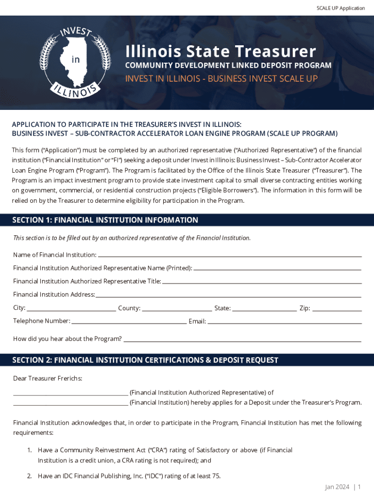 SCALE UP ApplicationIllinois State TreasurerCOMMUNITY DEVELOPMENT LINKED DEPOSIT PROGRAMINVEST IN ILLINOIS BUSINESS INVEST SCALE UPAPPLICATION TO PARTICIPATE IN THE TREASURERS INVEST IN ILLINOIS: