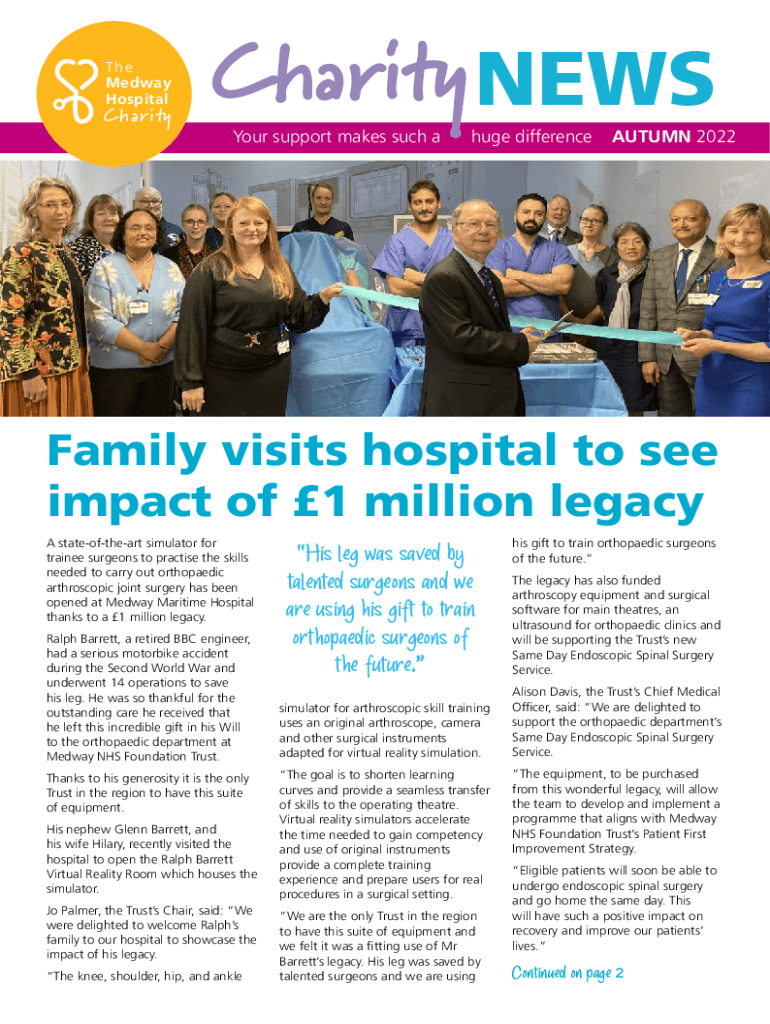 T he Medway HospitalCha ri tyCharity NEWS Your support makes such ahuge differenceAUTUMN 2022Family visits hospital to see impact of 1 million legacy A stateoftheart simulator for trainee surgeons
