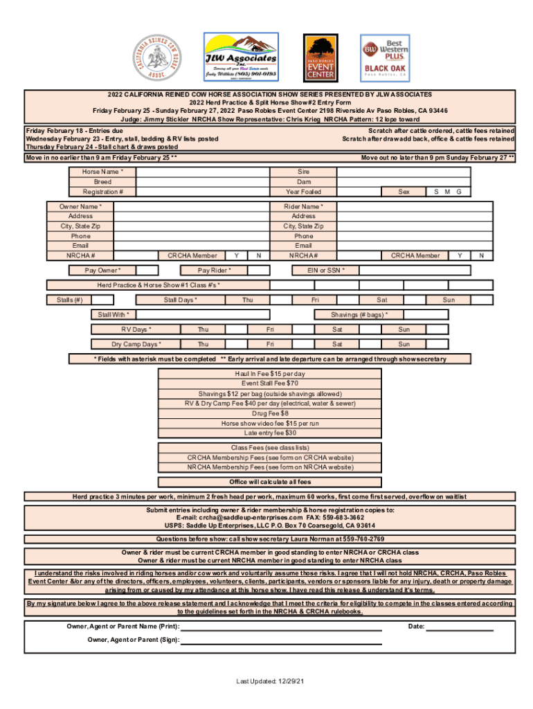 2022 Herd Practice & Split Horse Show #2 Entry Form