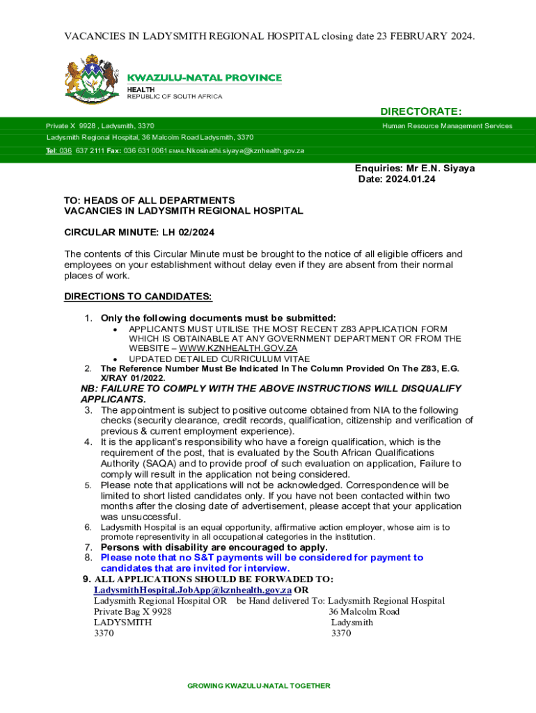 VACANCIES IN LADYSMITH REGIONAL HOSPITAL closing date 23 FEBRUARY 2024.DIRECTORATE: Private X 9928 , Ladysmith, 3370Human Resource Management ServicesLadysmith Regional Hospital, 36 Malcolm Road Ladysmith,