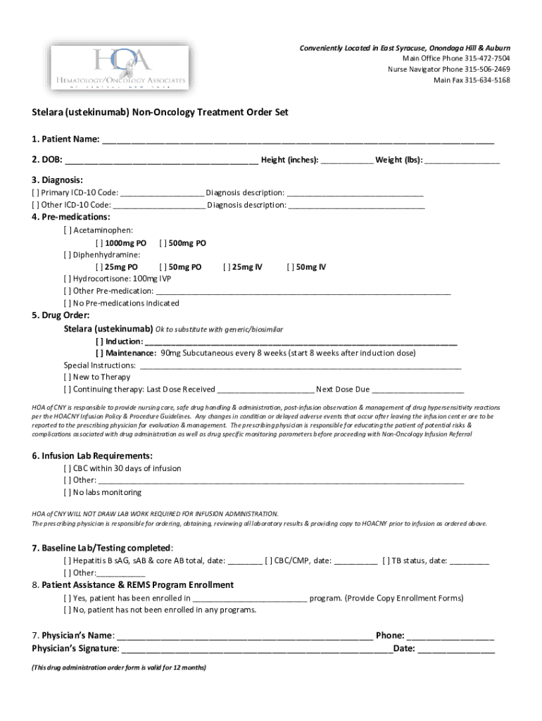 Main Fax 3156345168Stelara (ustekinumab) Oncology Treatment Order Set