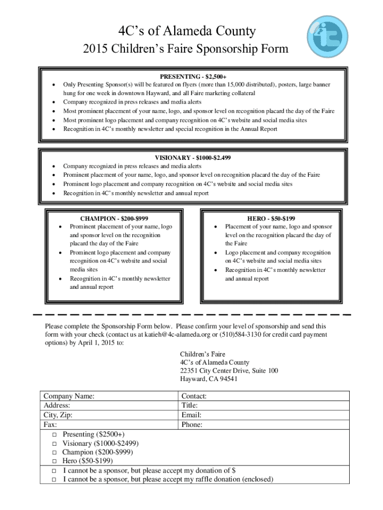 4Cs of Alameda County 2015 Childrens Faire Sponsorship Form PRESENTING $2,500+ Only Presenting Sponsor(s) will be featured on flyers (more than 15,000 distributed), posters, large banner hung for