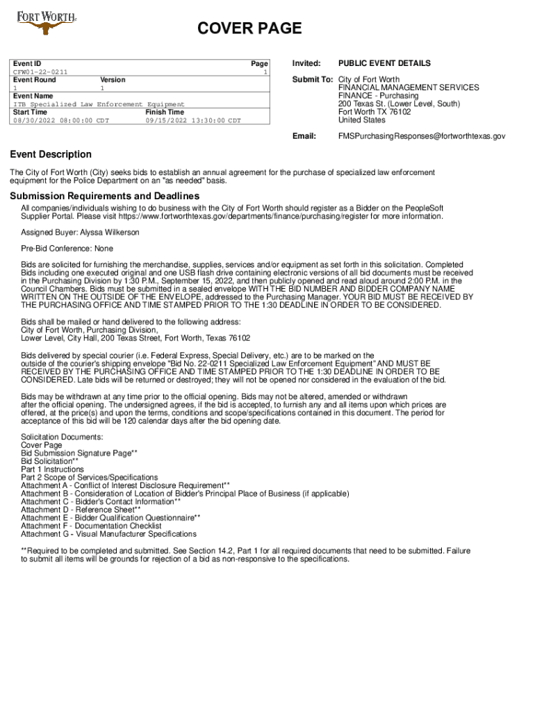 COVER PAGE Event ID CFW01220211 Event Round Version 1 1 Event Name ITB Specialized Law Enforcement Equipment Start Time Finish Time 08/30/2022 08:00:00 CDT 09/15/2022 13:30:00 CDTPage 1Invited:PUBLIC