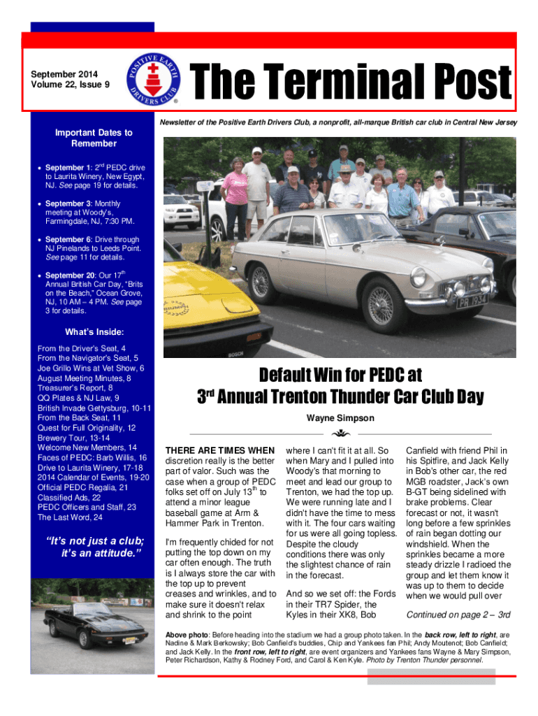 Newsletter of the Positive Earth Drivers Club, a nonprofit, all marque British car club in Central New JerseyImportant Dates to