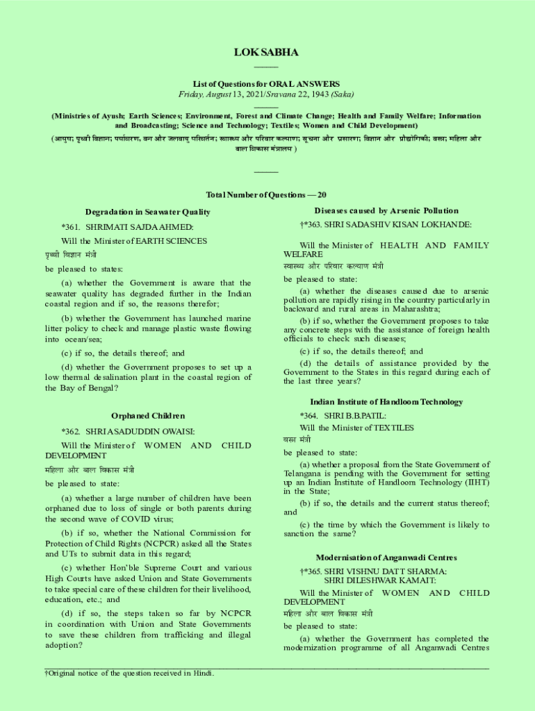 OK SASHA ___List of Questions for ORAL ANSWERS Friday, August 13, 2021/Havana 22, 1943 (Aka) ___ (Ministries of Ayush; Earth Sciences; Environment, Forest and Climate Change; Health and Family Welfare;