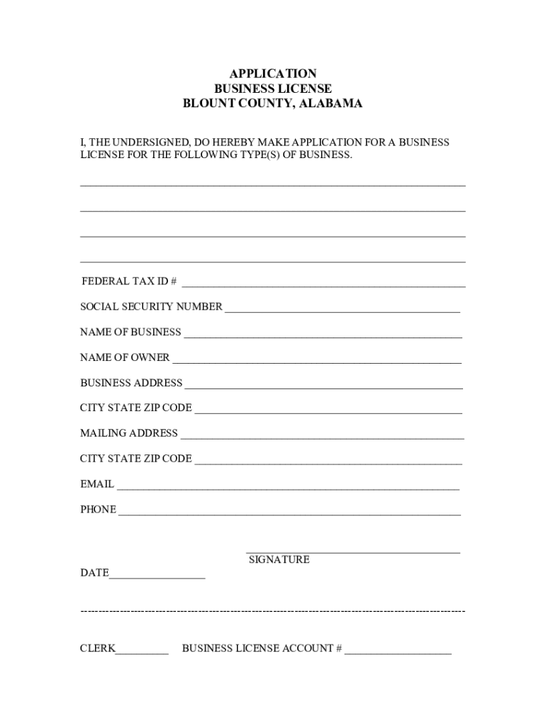 APPLICATION BUSINESS LICENSE BLOUNT COUNTY, ALABAMA I, THE UNDERSIGNED, DO HEREBY MAKE APPLICATION FOR A BUSINESS LICENSE FOR THE FOLLOWING TYPE(S) OF BUSINESS. ___ ___ ___ ___ FEDERAL TAX ID # ___