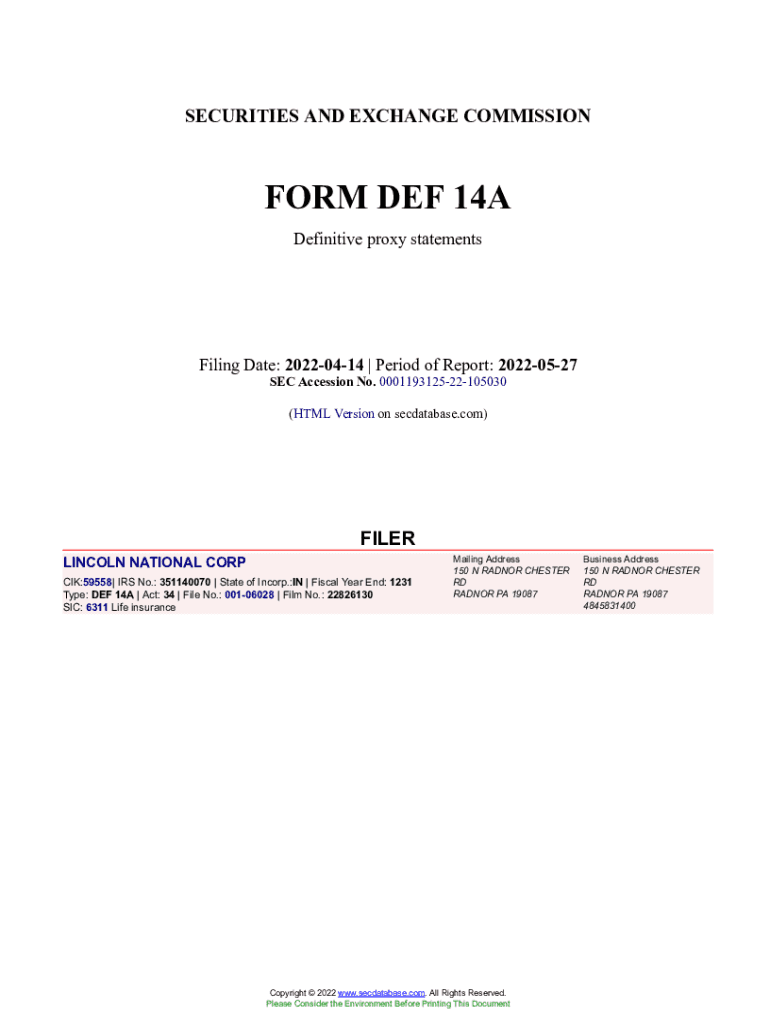 Get the free LINCOLN NATIONAL CORP Form DEF 14A Filed 2022-04-14. Accession Number