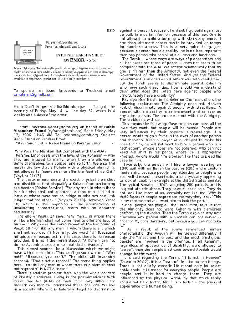 The Weekly Parsha: From A Student Perspective is a writable document that has to be completed and signed for specific needs. In that case, it is provided to the relevant addressee in order to provide certain information of certain kinds. The completion and signing is able in hard copy by hand or using a trusted solution e. g. PDFfiller. These applications help to submit any PDF or Word file without printing out. While doing that, you can customize its appearance for your needs and put legit electronic signature. Upon finishing, you send the Weekly Parsha: From A Student Perspective to the respective recipient or several of them by mail or fax. PDFfiller has a feature and options that make your blank printable. It offers different settings for printing out appearance. It doesn't matter how you send a form after filling it out - physically or by email - it will always look professional and clear. In order not to create a new editable template from scratch again and again, make the original file as a template. Later, you will have a customizable sample.