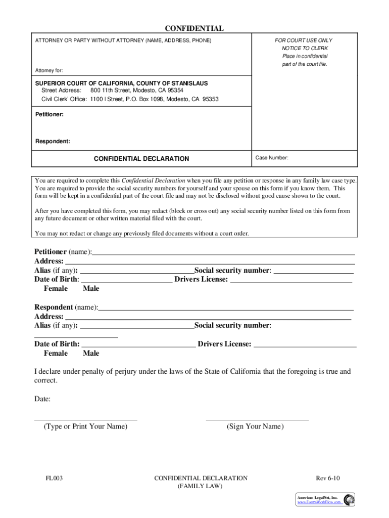 CONFIDENTIAL ATTORNEY OR PARTY WITHOUT ATTORNEY (NAME, ADDRESS, PHONE)FOR COURT USE ONLY NOTICE TO CLERK Place in confidential part of the court file.Attorney for:SUPERIOR COURT OF CALIFORNIA, COUNTY