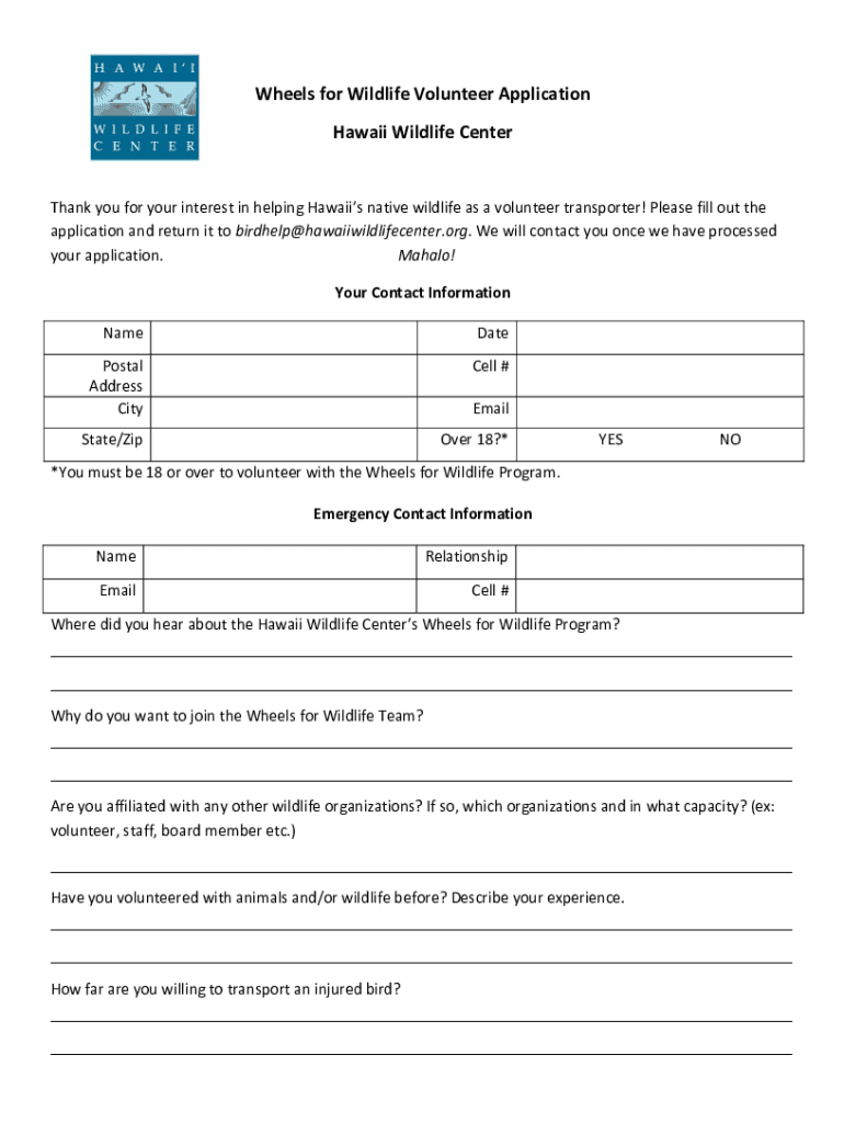 Get the free Wheels for Wildlife Volunteer Application Hawaii Wildlife Center