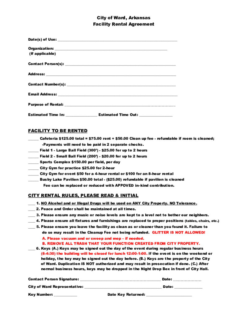City of Ward, Arkansas Facility Rental Agreement Date(s) of Use: ___ Organization: ___ (If applicable) Contact Person(s): ___ Address: ___ Contact Number(s): ___ Email Address: ___ Purpose of Rental: