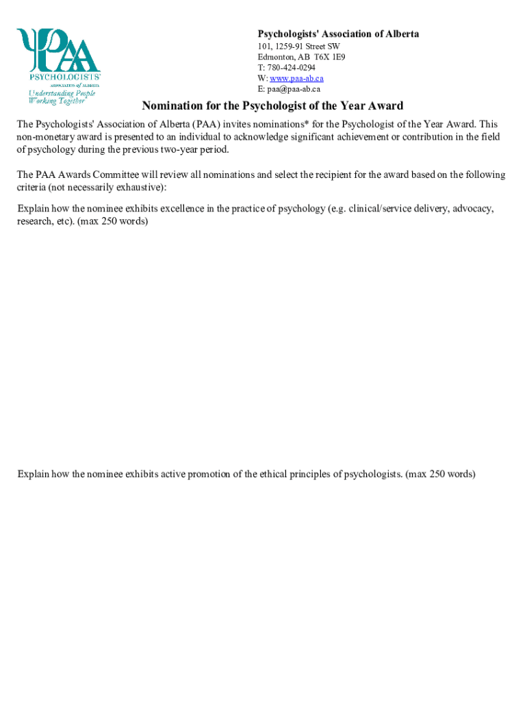 Psychologists\' Association of Alberta 101, 125991 Street SW Edmonton, AB T6X 1E9 T: 7804240294 W: www.paaab.ca E: paa@paaab.caNomination for the Psychologist of the Year Award The Psychologists\'