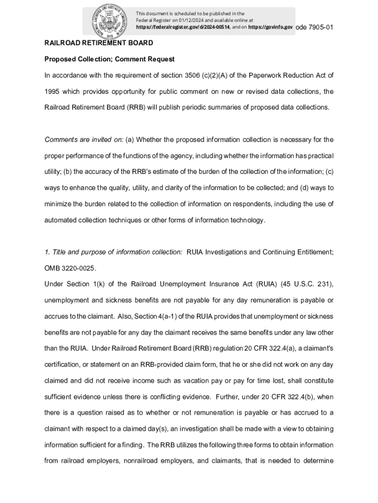 This document is scheduled to be published in the Federal Register on 01/12/2024 and available online at https://federalregister.gov/d/202400514, and on https://govinfo.gov Billing Code790501RAILROAD